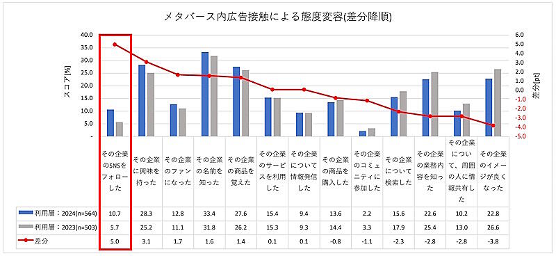メタバースサービス内で企業の広告に接触した利用層の態度変容は、最多が「その企業の名前を知った」で33.4%(同1.6ポイント増)。「その企業に興味を持った」が28.3%(同3.1ポイント増)で続いた。