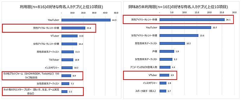 好きな有名人カテゴリは、メタバースサービスの「利用層」では「VTuber」が14.8%だったが、「興味あり未利用層」では「VTuber」は3.9%だった。どちらの層でも、「YouTuber」「男性アイドル・タレント・俳優」が上位となっている。
