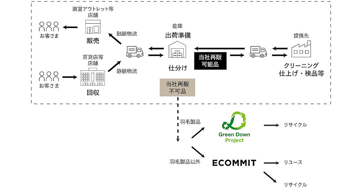 再販売しない回収品のうち、品質表示のダウン率が50%以上の羽毛製品は「グリーンダウンプロジェクト」を通じて羽毛のリサイクルを実施。その他の回収品は協業先を通じてリユース、リサイクル(繊維製品の素材/固形燃料など)している。三陽商会におけるリユース率は平均35%程度で推移しており、提携先を通じたリユース率は99%を達成したという。