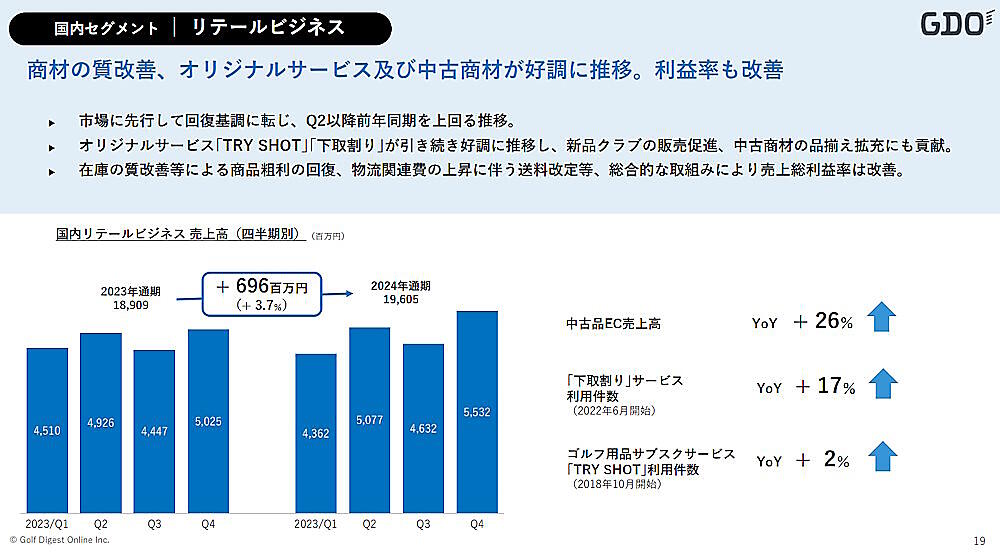 引き続き、中古事業が好調に推移しており、売上高は対前年比で120%程度に成長した。(ゴルフクラブの購入と同じタイミングで手持ちのゴルフクラブの買い取りができ、買い取り額との差額で決済する)「下取り割」や、(ゴルフクラブのサブスクリプション型サービスである)「トライショット」といったサービスが変わらず好調に伸びている。