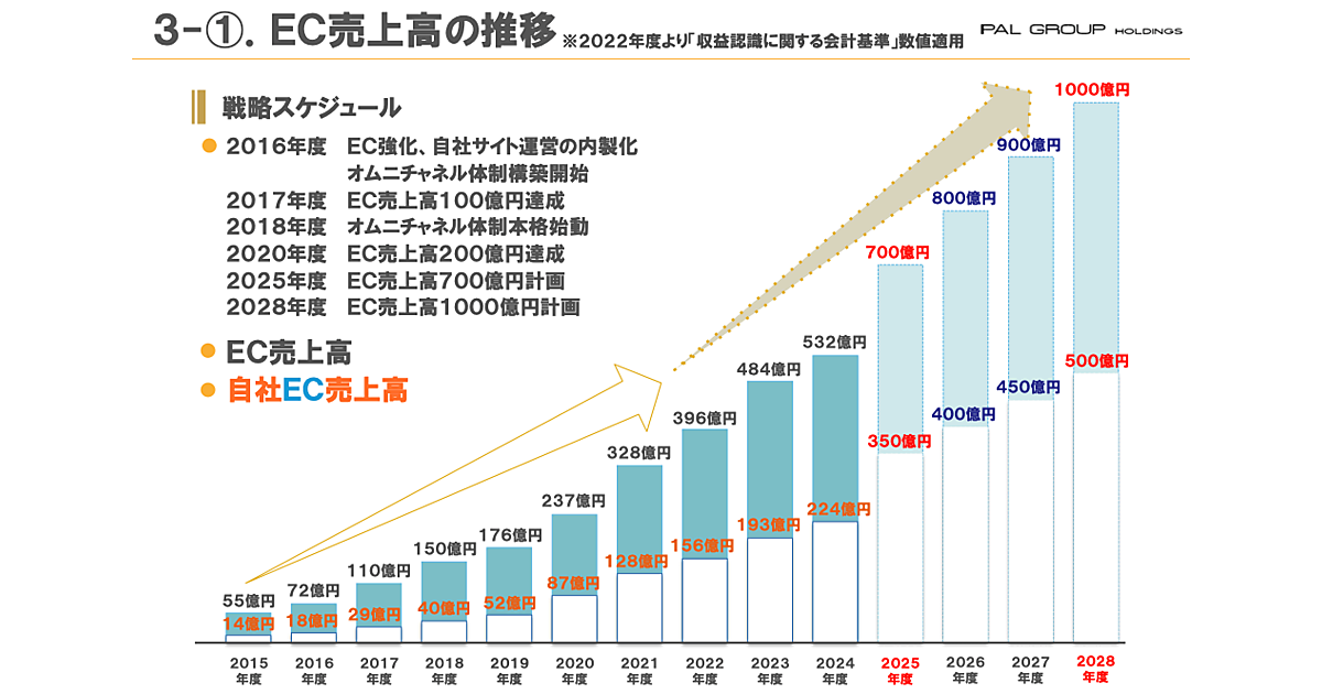 パルグループHDの2026年2月期におけるEC売上高は、同31.6%増の700億円をめざす。4年後の2029年2月期にはEC売上高1000億円を計画している。