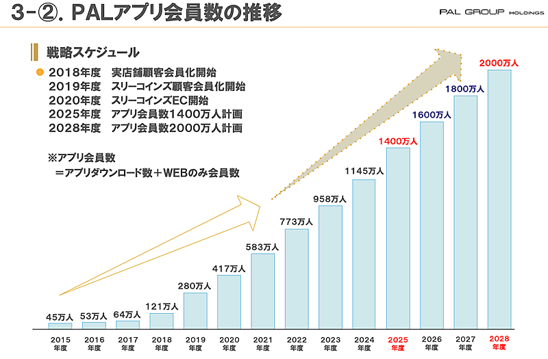 パルグループの公式アプリ「PAL CLOST(パルクローゼット)」の2025年2月期会員数は同19.5%増の1145万人。アプリ会員数は、アプリダウンロード数とWebのみの会員数を合計したもので、2026年2月期は同22.3%増の1400万人を計画しており、2029年2月期には2000万人到達を目標に掲げている。