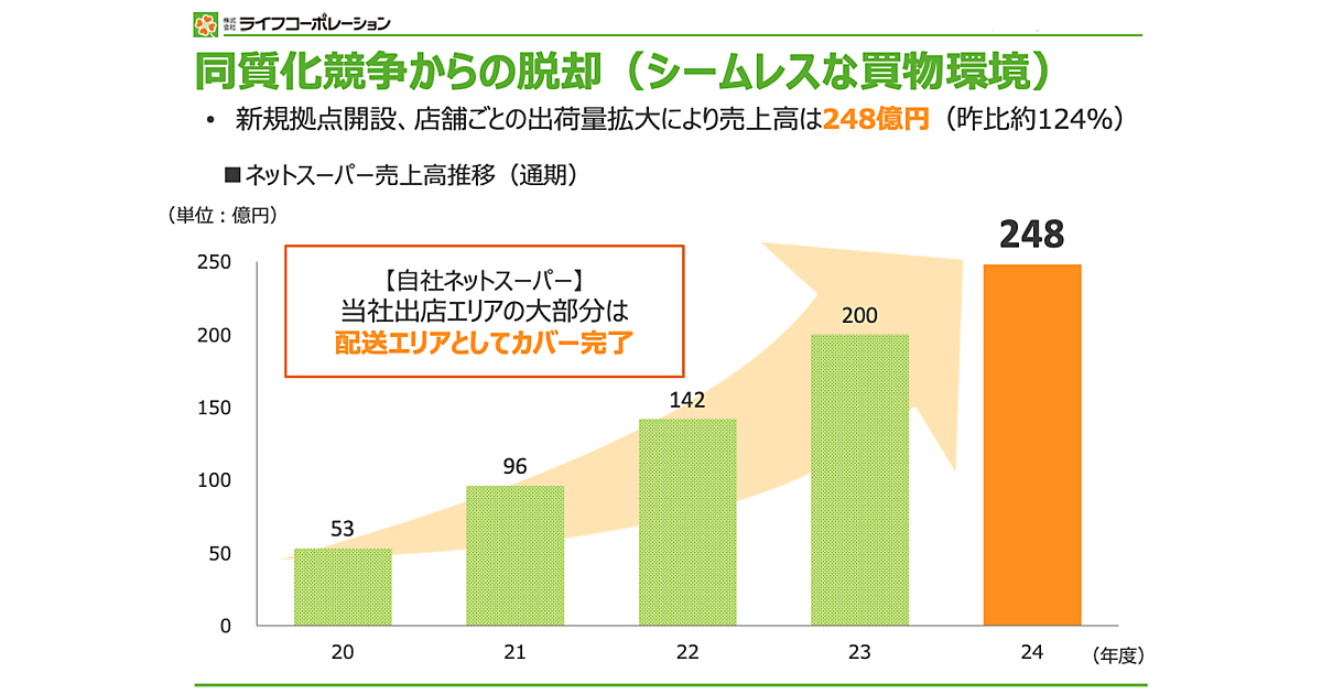 ライフコーポレーションの2025年2月期EC売上高は、前期比約24%増の248億円だった。EC売上高はライフネットスーパーおよびAmazon上のネットスーパーの合計金額。
