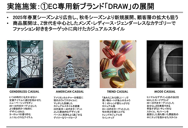 計画するEC専用新ブランドの名称は「DRAW」。2025年春夏シーズンから広告し、秋冬シーズンに新規展開する予定。顧客層の拡大も狙いZ世代を中心としたメンズ・レディース・ジェンダーレスなカテゴリーで展開する。ファッション好きをターゲットに向けたカジュアルスタイルとした。