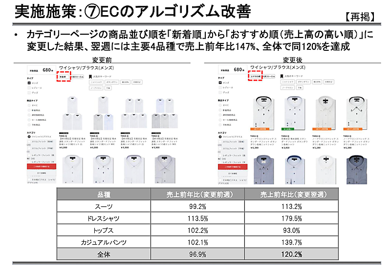 ECサイト関連ではサイト改善などにも着手する。すでにECサイトの商品表示アルゴリズムの変更を実施。カテゴリーページの商品並び順を「新着順」から「おすすめ順(売上高の高い順)」に変更したところ、翌週には主要4品種で売り上げが前年比47%%増、全体で同20%増を達成したという。