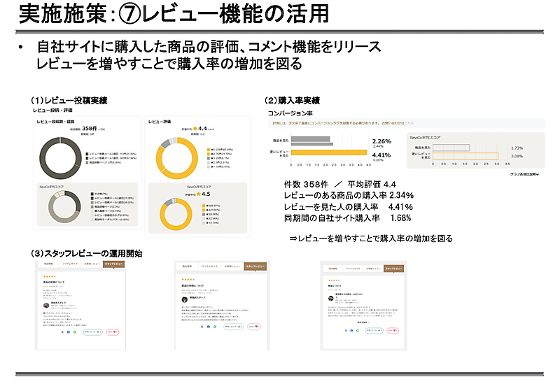 レビュー機能も充実させる。自社サイトに購入した商品の評価、コメント機能をリリース。レビューを増やすことで購入率の増加を図る。