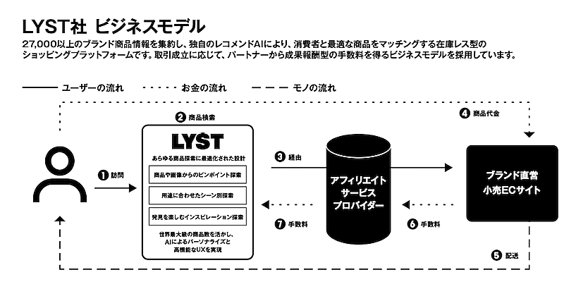 主要展開エリアはアメリカ、イギリス、ドイツなど。「LYST」は2万7000以上のブランド商品情報を集約し、独自のレコメンドAIでユーザーと最適な商品をマッチングする在庫レス型のショッピングプラットフォーム。いわゆるアフィリエイトサイトで、取引が成立するとASP(アフィリエイトサービスプロバイダー)を通じてパートナーから成果報酬型の手数料を得るビジネスモデルを採用している。