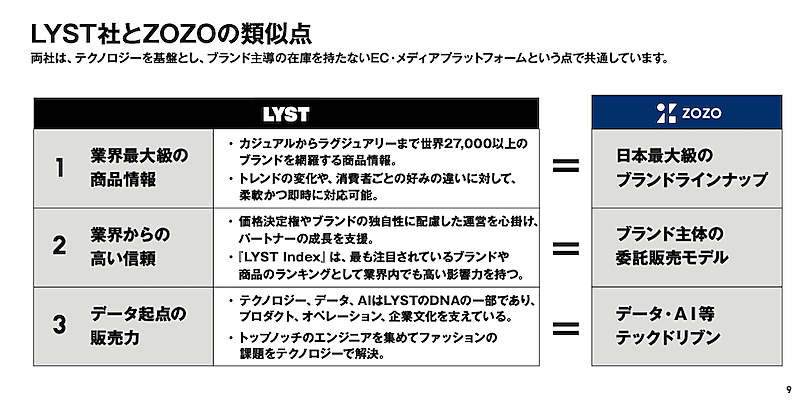 ZOZOはLYST社との類似点に、テクノロジーを基盤にブランド主導の在庫を持たないEC・メディアプラットフォームという点をあげる。