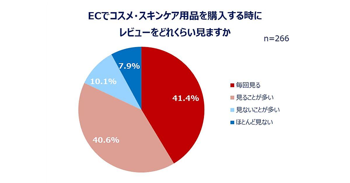ECで販売しているコスメのレビューを見る頻度を聞いたところ、最も多かったのは「毎回見る」で41.4%。「見ることが多い」が40.6%。「見ないことが多い」が10.1%、「ほとんど見ない」が7.9%で続いた。