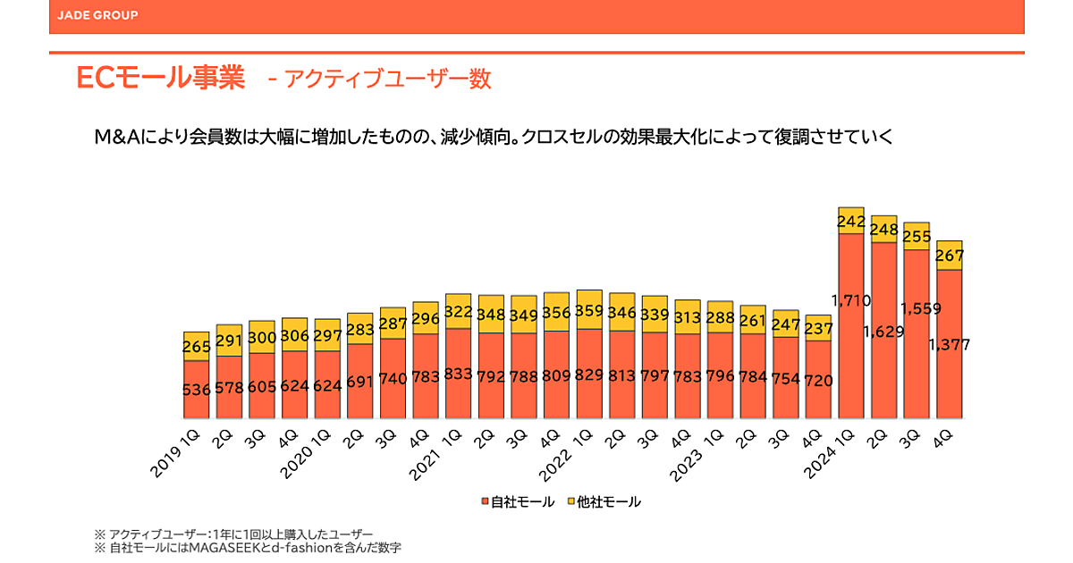 取扱高の内訳はECモール事業が前期比63.8%増の255億8100万円。プラットフォーム事業が同149.2%増の183億6500万円。ブランド事業は13.1%増の64億5300万円。ECモール事業ではマガシークのM&Aでアクティブユーザー数が大幅に増加した。ただ、アクティブユーザー数は減少傾向にあるといい、クロスセルの効果最大化によって復調をめざす。