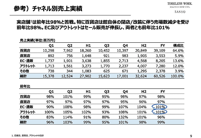 そのほかチャネル戦略について、百貨店は主販路として出店を強化、直営店・EC・アウトレットといった販路の成長を図り、百貨店比率を低減させる。直営店、アウトレットも出店強化の方針を示した。
