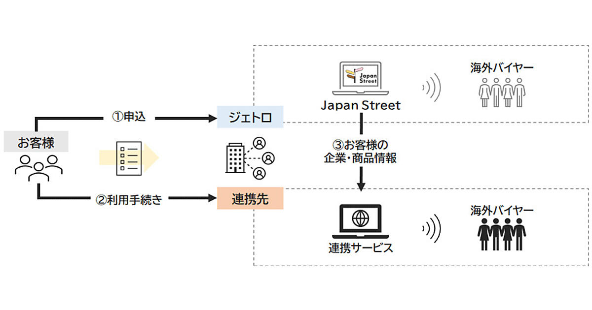 輸出を強化したい日本企業が「JAPAN LINKAGE」の取り組みに参加を希望する場合、まずは「Japan Street」への登録が必要となる。関心のある連携サービスを選択しジェトロへ申し込み、それぞれを利用の手続きを進める。利用手続きが完了したサービスについて、ジェトロが「Japan Street」上の企業情報や商品情報のデータを、サービスの実施主体である民間事業者へ提供し、サービスの提供が開始され、「Japan Street」とは別で各民間サービスごとにつながっている海外バイヤーにそれらの情報が届く。