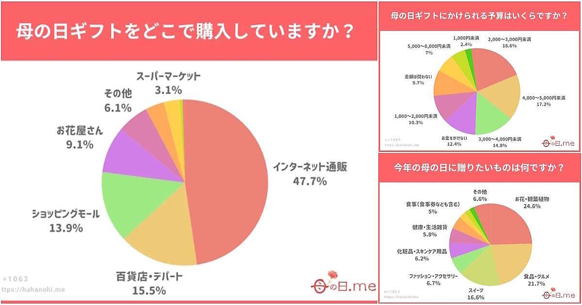 まくらの子会社で、母の日に特化した情報メディアサイト「母の日.me」を運営するGroovは、2025年の「母の日」のギフトに関する意識調査の調査結果を公開した。調査によると、購入場所はECサイトが約半数を占めている。