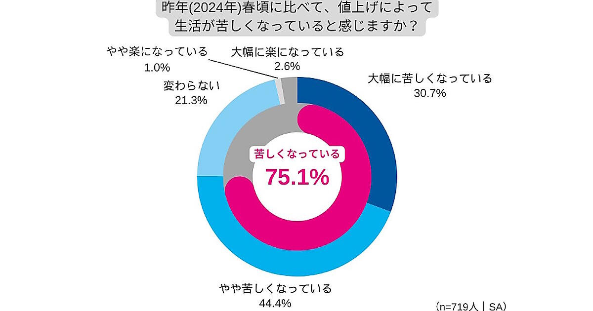 2024年春頃と比べて、値上げによって生活が苦しくなっていると感じるかを聞いたところ、「やや苦しくなっている」が最多で44.4%、「大幅に苦しくなっている」が30.7%。合計すると75.1%が「苦しくなっている」と感じている。