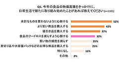 日々の暮らしのなかで特に値上がりを実感しているものは、「お米」が最多で79.9%、続いて「お米以外の食品・飲料」が67.3%、「ガソリン」が52.5%、「日用品」が46.8%、「水道光熱費」が44.3%、「外食」が40.0%だった。