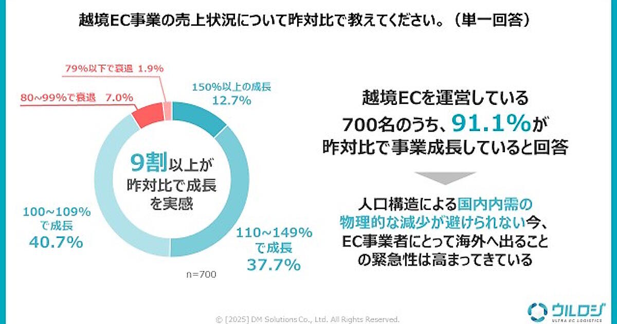 EC物流代行サービス「ウルロジ」などを手がけるディーエムソリューションズは、越境EC事業を手がける全国の20歳〜50歳代の責任者や担当者700人を対象に実施した「越境EC事業の運用手法に関する実態調査」の結果を発表した。
