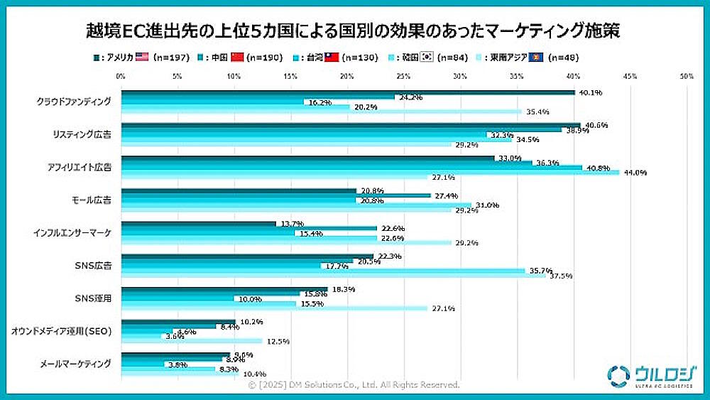 5か国以上に進出しているEC事業者に越境EC運用で効果のあったマーケティング施策を聞いたところ、最多は「リスティング広告」で39.8%、続いて「アフィリエイト広告」が36.1%、「SNS広告」が35.3%だった。「複数国に進出している企業がリスティング広告を重視しているのは、広範囲なターゲットに効率的にリーチできるというメリットがあらためて認識されているためと考えられる」(ディーエムソリューションズ)