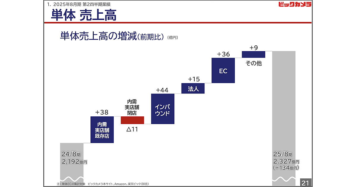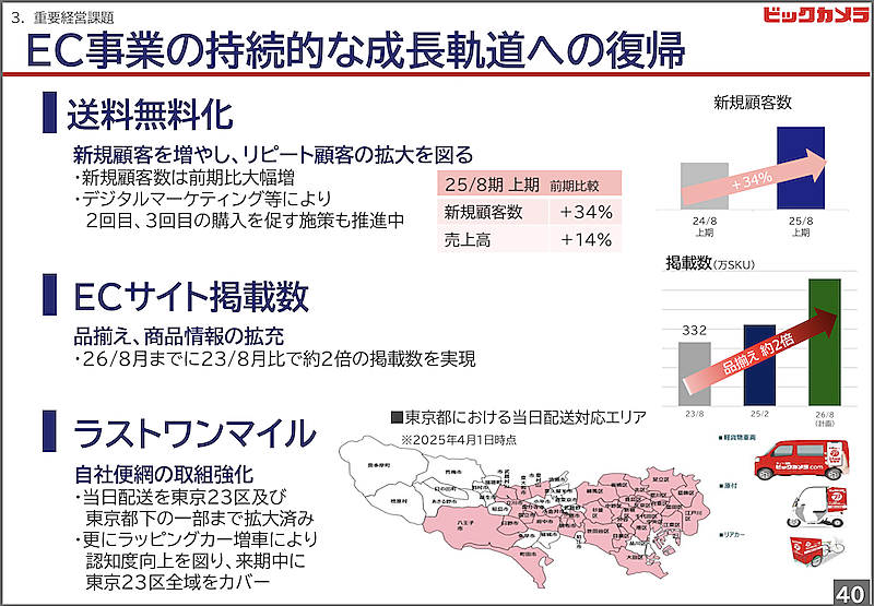 ビックカメラのEC事業が好調に推移している。2024年9月-2025年2月期(中間期)の決算説明によると、EC売上高の実数は非公開ながら前年同期比14%増の36億円増。新規顧客数は同34%増えたという。