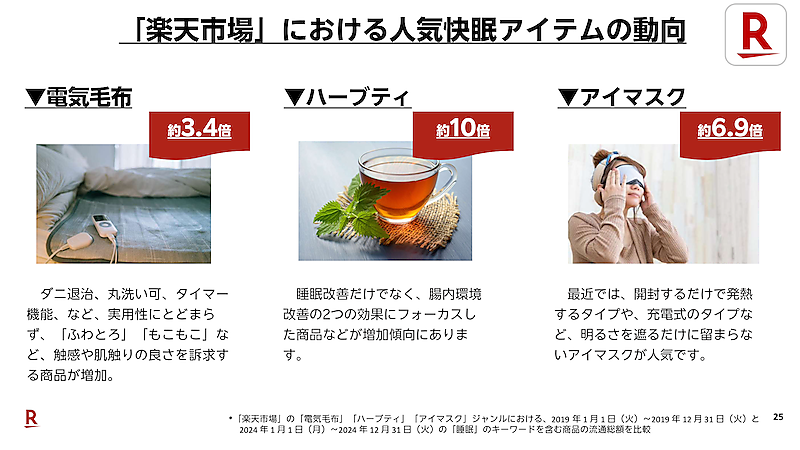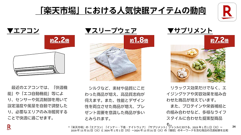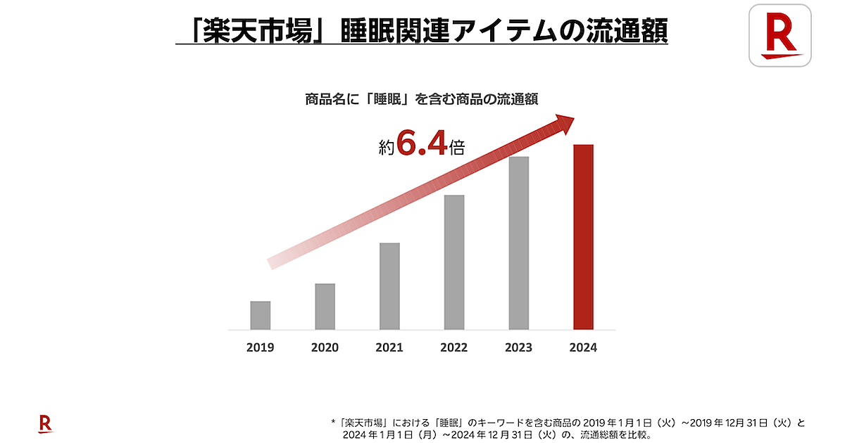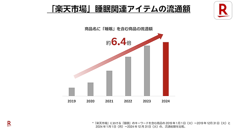 「楽天市場」では40万点以上の睡眠関連商品を取り扱っている。2024年の流通総額は、コロナ禍前の2019年と比較して約6.4倍に拡大。「インナー・下着・ナイトウェア」カテゴリにおいて「睡眠」のキーワードを含む商品の流通総額は同約1.8倍、睡眠中の室温調節に役立つ「エアコン」カテゴリは同約2.2倍、「サプリメント」カテゴリは同約7.2倍に伸長している。