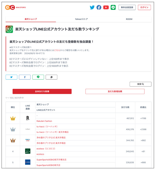 EC マスターズクラブのホームページで公開している「楽天ショップ LINE公式アカウント友だち数ランキング」によると、楽天市場の約55,000店舗のうち、LINEを利用しているのは8,500店舗、全体の約15%しかいない(2025年2月現在)。広告の運用に依存している楽天市場の店舗にとって、LINEはまだまだ未知のものであり、十分に伸びしろがある販促ツールといえる。