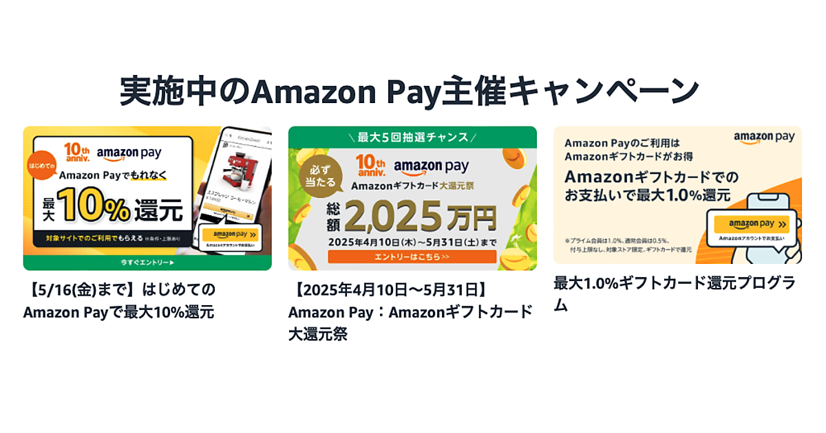 アマゾンジャパンは、Amazonのオンライン決済サービス「Amazon Pay」を導入している自社ECサイトでの買い物で「Amazonギフトカード」を還元する大規模キャンペーンを複数開催している。