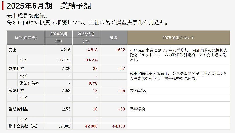 エアークローゼットの2024年6月期連結業績は、売上高が42億1600万円(前期比12.7%増)だった。営業損失は3500万円(前期は1億8800万円の損失)。