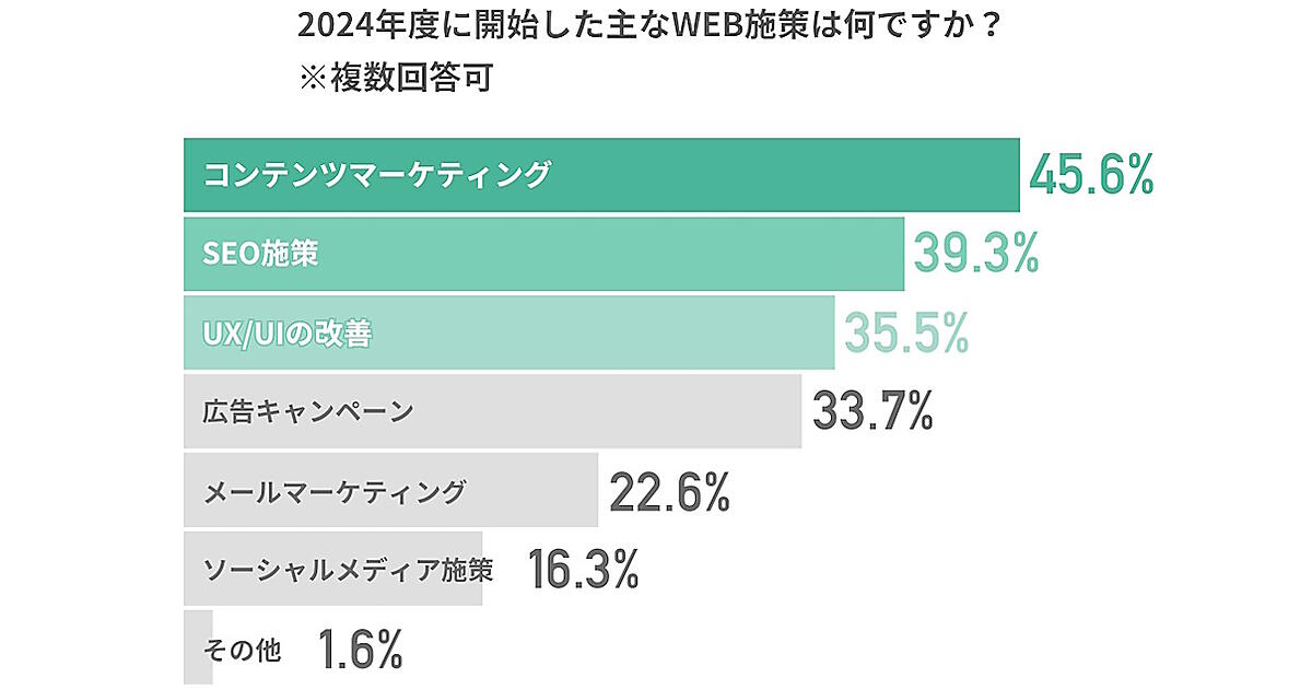 PRIZMAがWebサイト制作・運営担当者を対象に実施した調査によると、2024年度に開始したWeb施策で最も多かったのは「コンテンツマーケティング」で45.6%、続いて「SEO施策」「UX/UI改善」だった。