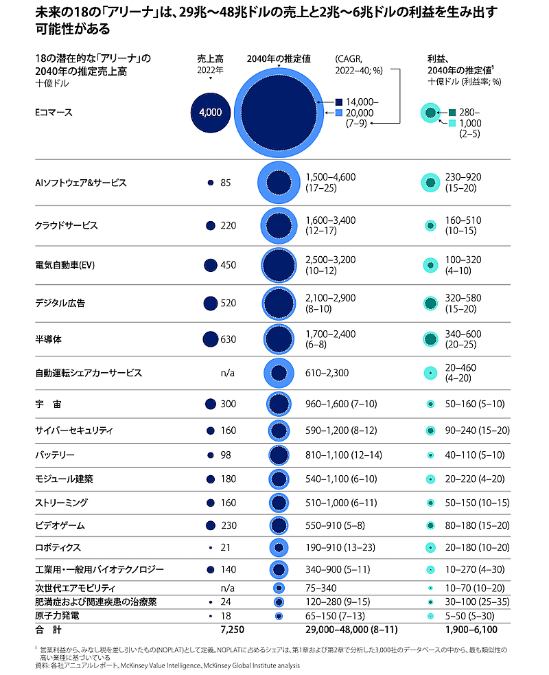 18のアリーナのうち、「Eコマース」を成長産業のトップにあげた。2022年に4兆ドルだったEコマースの売上高は、2040年に14兆ドル~20兆ドルに成長すると予測。2022年から2040年までのCAGR(年平均成長率)は7〜9%になるとした。利益は2800億ドル~1兆円、CAGRは2〜5%になると推定している。