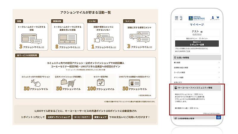 「キーコーヒーファンコミュニティ」でコメントや画像の投稿、投稿に対する「いいね」などのアクションをすると、「アクションマイル」が付与される。「アクションマイル」は一定数貯まると、「キーコーヒー公式オンラインショップ」「コーヒーセミナー」「LINEデジタル会員証」で使える共通ポイントに自動的に変換される。「ReviCo」によりユーザーアクションをECサイト側にAPI連携することによって、「アクションマイル」の付与を実現した。