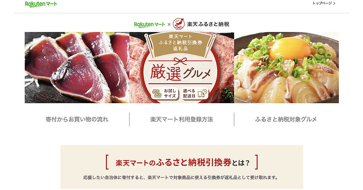 「楽天ふるさと納税」では、対象の自治体に寄付すると返礼品として受け取ることができる電子引換券「楽天マートふるさと納税返礼品引換券」を用意している。