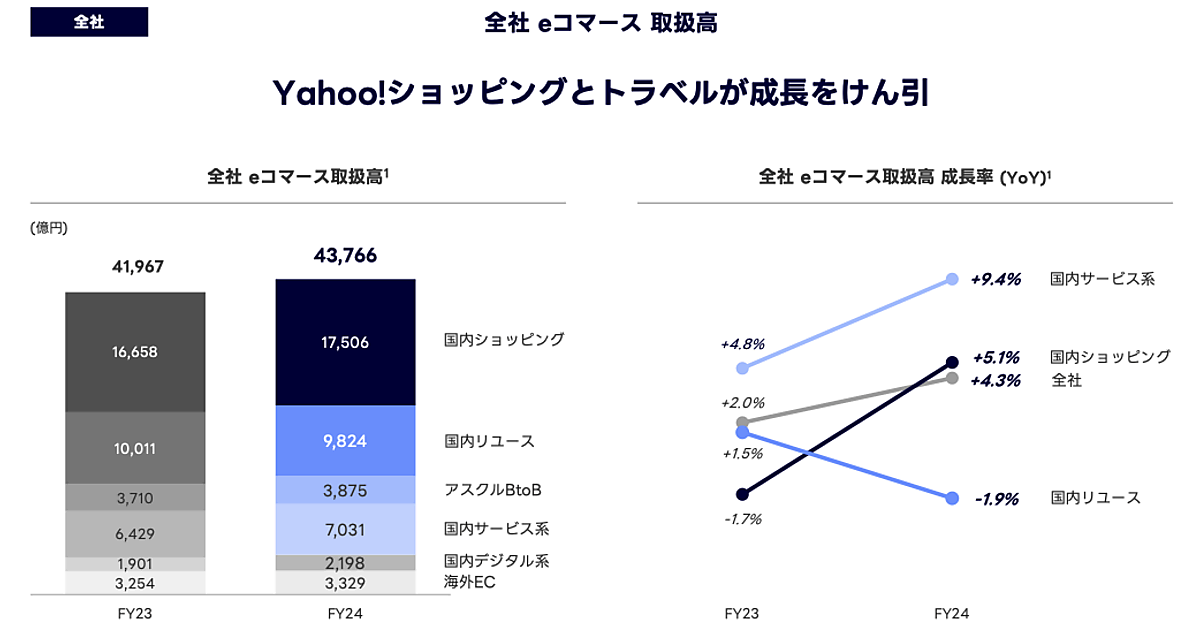 LINEヤフーの2025年3月期連結業績におけるeコマース取扱高は前期比4.3%増の4兆3766億円だった。「Yahoo!ショッピング」とトラベル事業が成長をけん引したという。