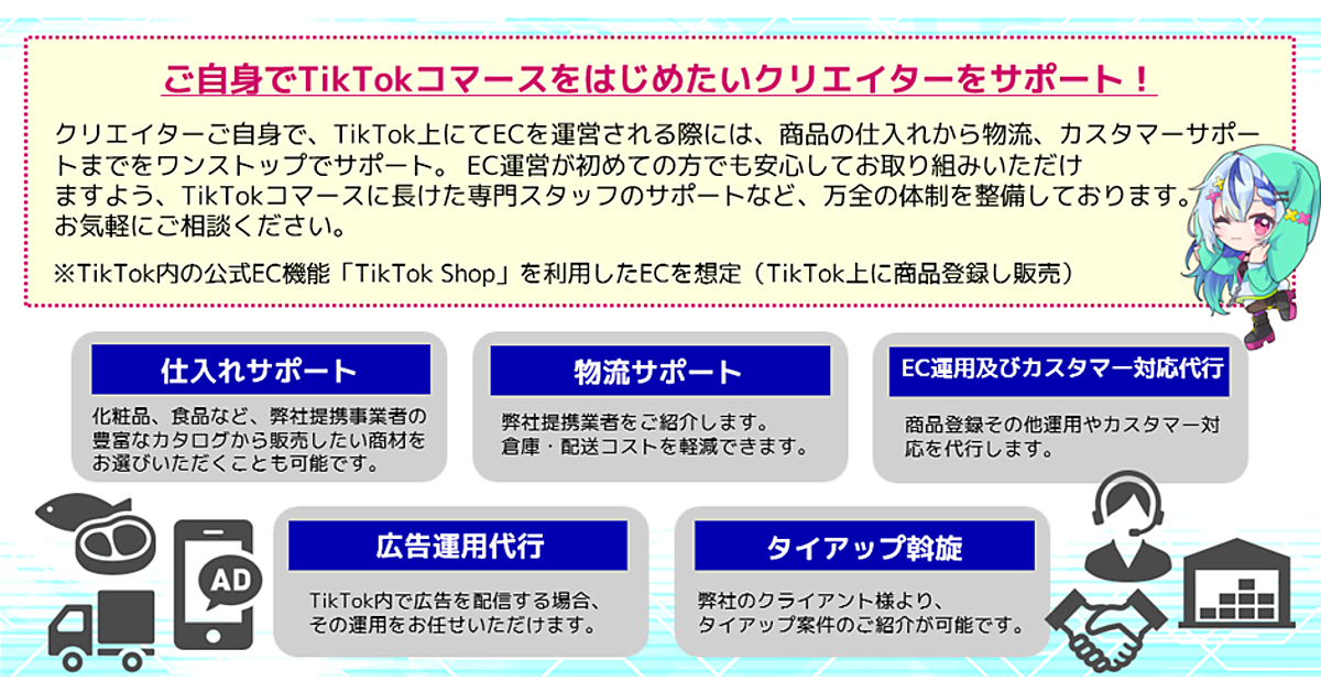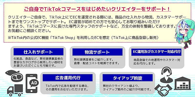 ピアラグループはこれまで、サイバースターを中心にVTuberやアーティストとのコラボを通じて、コンテンツ制作・マーケティング・販売支援を展開してきた。新たに開始する「TikTok Shop」のクリエイター向けコマース支援の具体的な内容は次の通り。