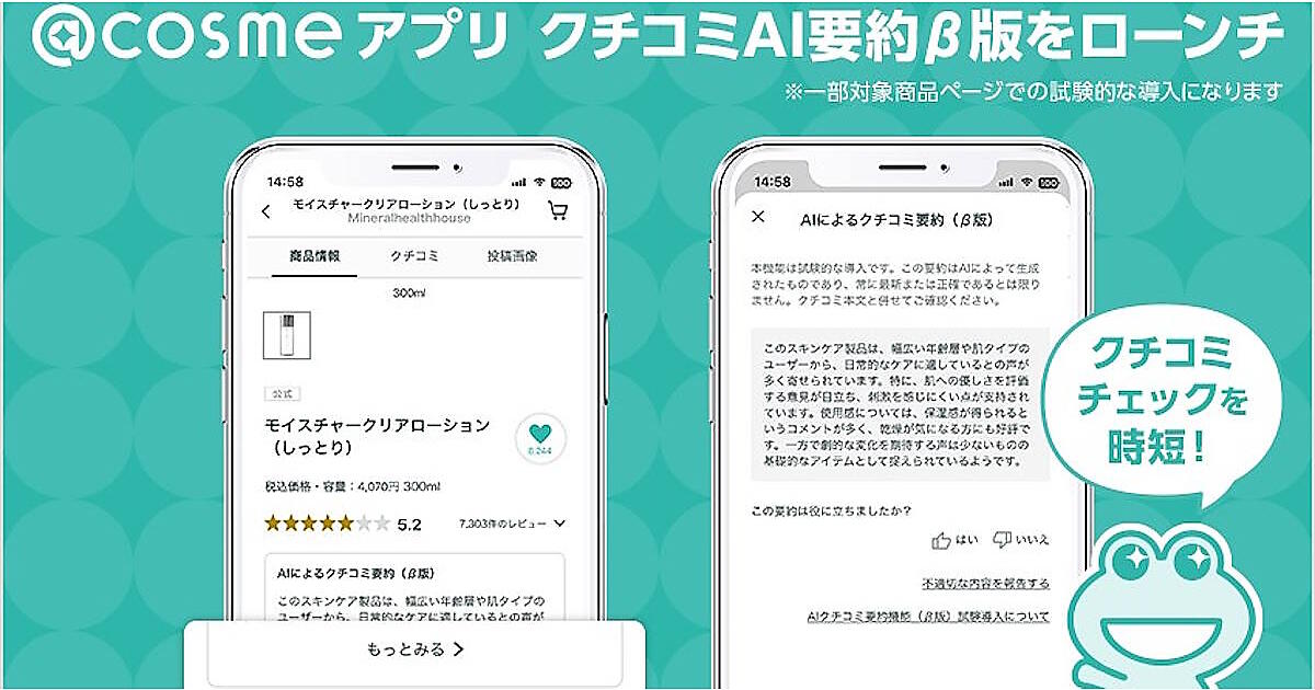 アイスタイルは、化粧品の総合情報サイト「@cosme」のアプリ内商品ページで展開している口コミのAI要約を表示する機能のβ版をアップデートし、対象商品を拡大した。β版は現在、約3000商品を対象に先行導入している。アイスタイルは利用状況などを踏まえ、正式版の搭載を検討する。