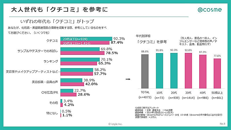 化粧品のモニターなどを通じてメーカーの商品開発に協力する「『@cosme』プロデュースメンバー」を対象に、アイスタイルが2024年1月に実施したアンケート調査によると、「化粧品・美容関連の情報収集で参考にするもの」として全ての年代で「クチコミ」が最も多く選ばれた。