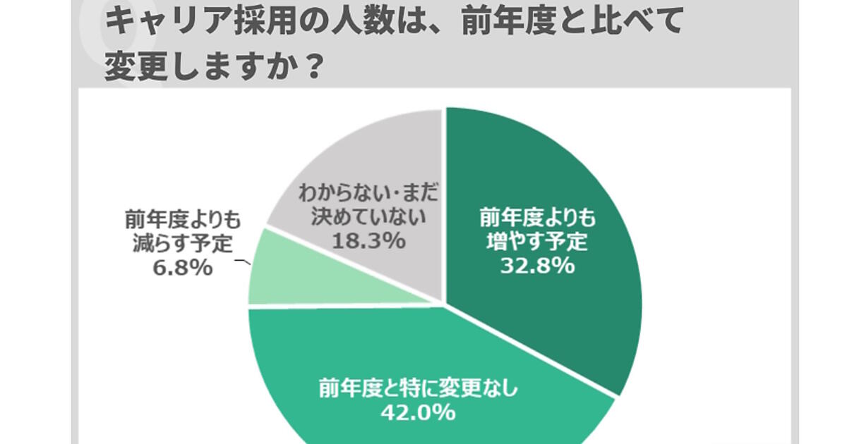 2024年度と比べてキャリア採用の人数に変更があるかを聞いたところ、「前年度と特に変更なし」が最多で42.0%、続いて「前年度よりも増やす予定」が32.8%だった。計7割以上の企業が2024年度と同程度またはそれ以上のキャリア採用を予定していることがわかった。「前年度よりも減らす予定」は6.8%。