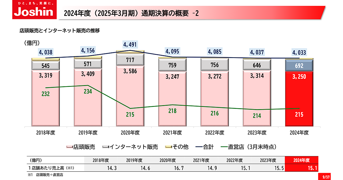 家電量販店「Joshin(ジョーシン)」を運営する上新電機の2025年3月期EC売上高は前期比7.0%増の691億5700万円だった。連結売上高は4032億5900万円で、EC化率は17.1%。