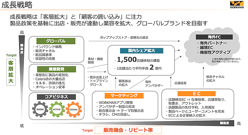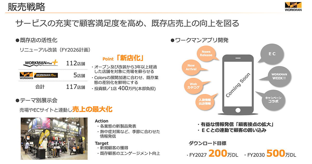 ワークマンは販売戦略において、サービスの充実で顧客満足度を高め、既存店売上の向上を図る方針を掲げている。その一環として開発するアプリは、お知らせや新商品情報、Webカタログ、入荷・出店、EC、キャンペーンコラボなどの情報を発信していく予定。ECとの連動で顧客の囲い込みを図る。