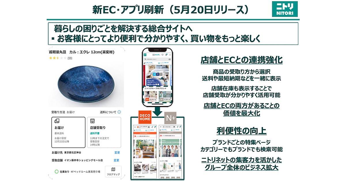 ニトリホールディングスは2026年3月の重点施策として、「EC・アプリ刷新・リアル店舗との連動」をあげている。5月20日にECサイトとアプリのリニューアルを実施、店舗とECとの連携を強化する。