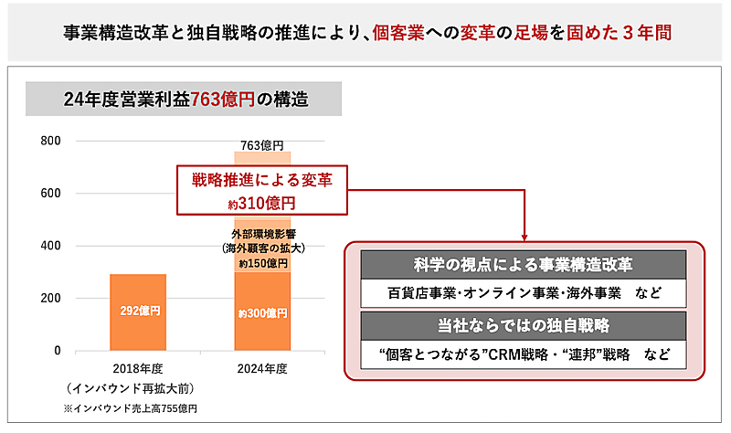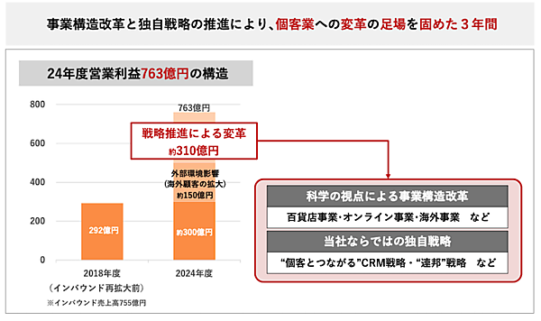 KPI(重要業績評価指標)として設定した「識別顧客売上高」「エムアイカード会員売上高」「年間100万円以上購買エムアイカード会員売上高」「デジタルIDのみ会員売上高」は中計期間中、右肩上がりで推移した。「科学の視点による事業構造改革」として百貨店事業、オンライン事業、海外事業に注力。独自戦略として「“個客とつながる”CRM戦略」などを推進した。 成果として、2025年3月期の営業利益は763億円。コロナ前の営業利益水準と比べ、戦略推進による変革で約310億円増、インバウンドなどで約150億円増となったと説明している。今後の取り組みとして、個客業プロセス活動を本格展開し、仕組みとコンテンツ拡充で識別顧客の利用拡大をめざす。