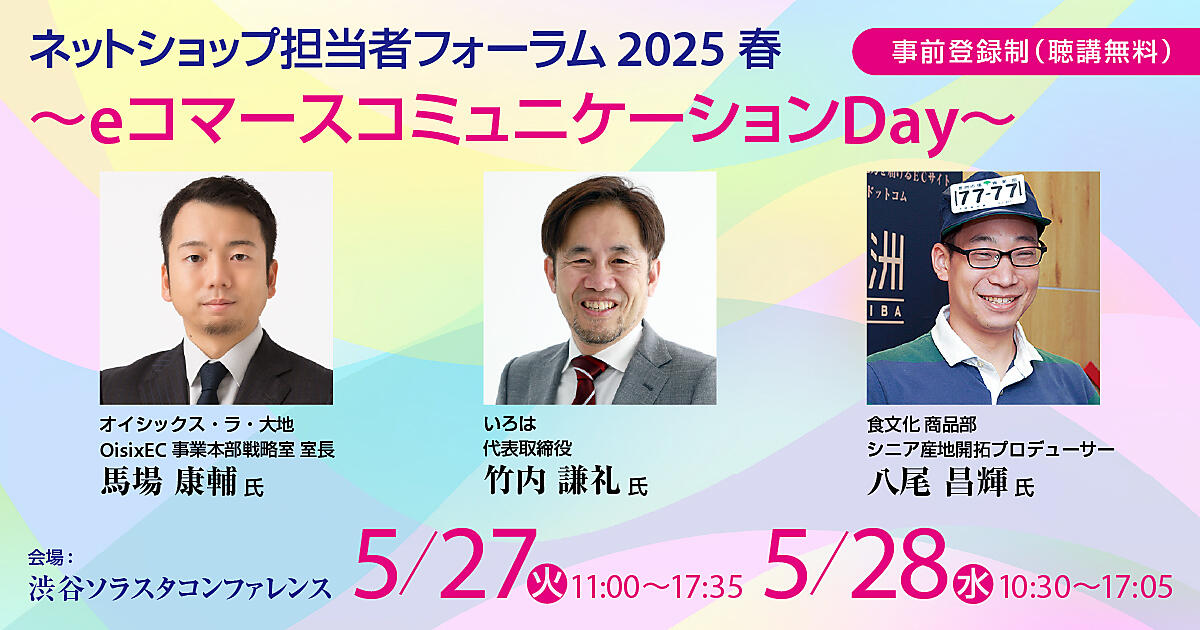 5月27日(火)+28日(水)に大型オフラインECイベント「ネットショップ担当者フォーラム 2025 春 ~eコマース コミュニケーションDay~」を東京・渋谷ソラスタコンファレンスでリアル開催。オイシックス・ラ・大地、食文化、良品計画、資さん、ヤマダデンキなど著名企業の実践的事例や知見を学べるセミナーを多数用意しています。さまざまなテーマのセッションは、すべて無料!(事前登録制、ECを実施している企業のみの限定イベントです)。まだお申し込みをしていない方のために、編集部おすすめの講演の見どころをご紹介します。