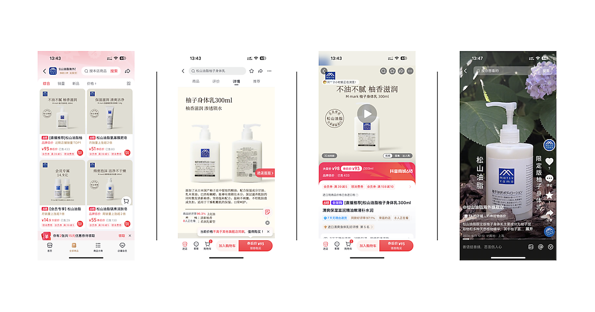 中国において、中国市場でのブランド認知拡大と越境EC市場におけるシェア拡大をめざし、現地の消費者に向けたプロモーションを展開。運用事例として、ボディケアブランド「松山油脂」の製品を、中国のショート動画プラットフォーム上の越境ECプラットフォーム「抖音電商全球購買(Douyin EC Global)」にて販売する「松山油脂海外旗艦店」を開設・運用している。