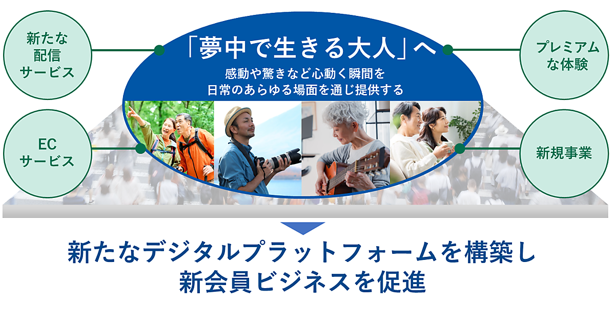 WOWOWの中計は、ビジョンである「独自のエンターテインメント発想で、あなたの日常に心動く瞬間を」の下、「会員の日常に"夢中"を提供する企業」への進化をめざす。具体的な取り組みとして、配信サービス、ECなどさまざまなサービスをつなぐ新たなデジタルプラットフォームを構築。これまでの放送・配信サービスに加入中である会員の満足度向上をめざすと同時に、新たな会員の獲得を通じて「夢中で生きる大人」を増やす。