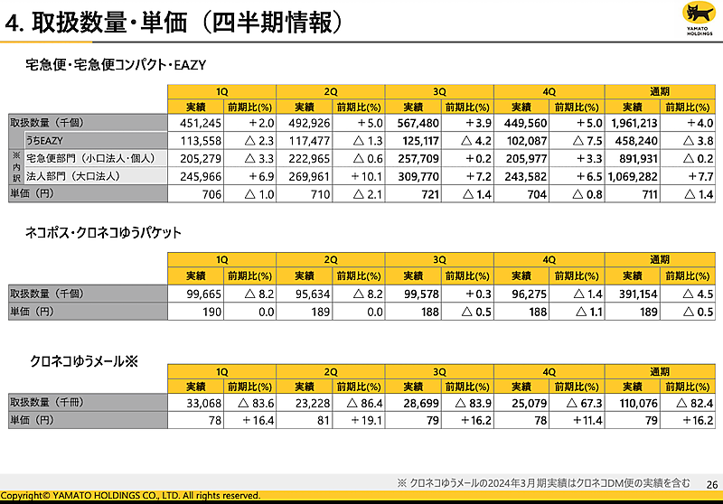 一方、法人部門のプライシング適正化により取扱数量は前期比0.6%減となると想定。「取扱数量の変化に応じて柔軟に対応できるよう、オペレーションの変革にも並行して取り組む」(ヤマトHD)としている。