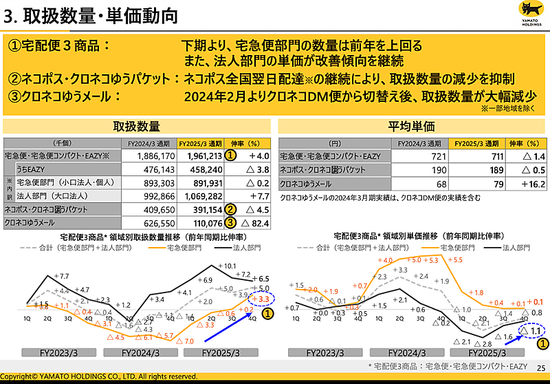 ヤマトHDによると、これまで取り組んできたプライシング適正化交渉の結果が単価に反映し始めているという。2025年3月期は低採算顧客への交渉やクール便料金改定の反映などで、下期から単価が改善傾向に。引き続き付加価値に応じた適正なプライシングに注力することで、平均単価の押し上げをめざすという。