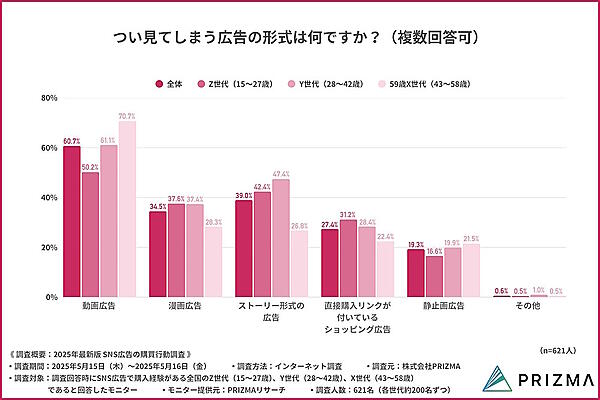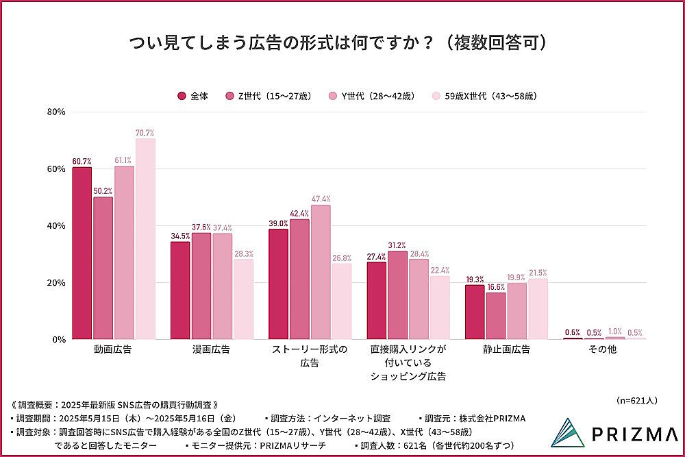 PRIZMAが実施した「2025年最新版 SNS広告の購買行動調査」によると、購買につながるSNS広告の形式は「動画広告」がトップだった。また、Z世代、Y世代、X世代の全世代で約7割が「購入予定がなかった商品をSNS広告をきっかけに購入した」と回答しており、SNS広告が新たな購買行動のきっかけになっていることがわかった。