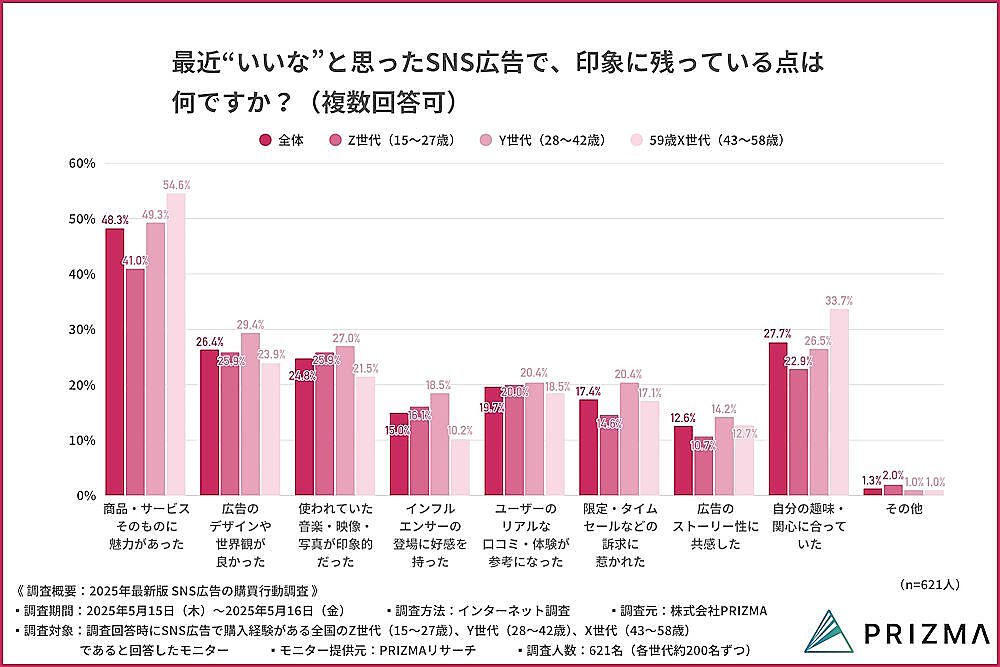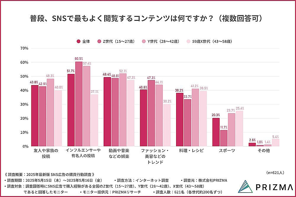 調査対象は、SNS広告で購入経験がある全国のZ世代(15〜27歳)、Y世代(28〜42歳)、X世代(43〜58歳)の各世代約200人ずつ、計621人。調査期間は2025年5月15~16日。