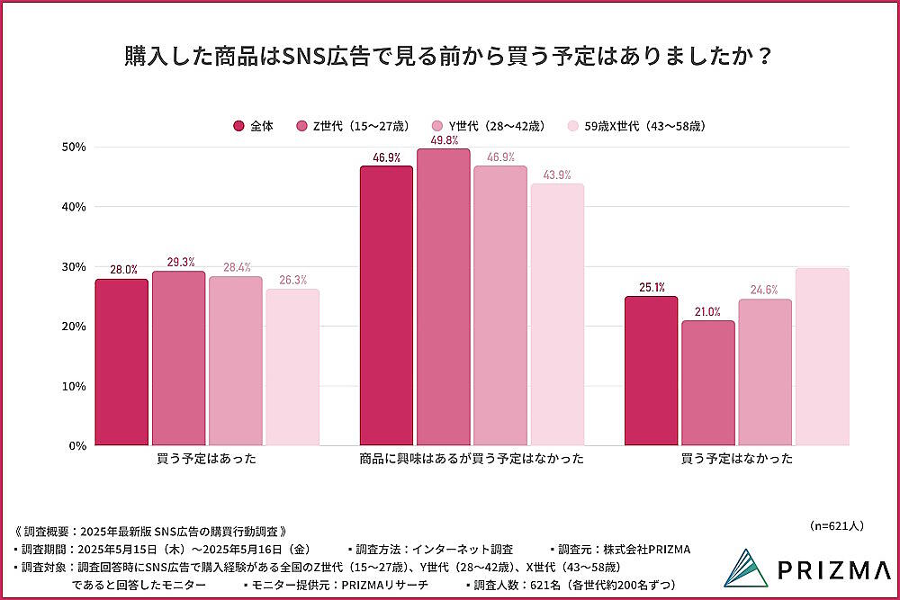 購入した商品はSNS広告で見る前から買う予定があったかを聞いたところ、全体では最多が「商品に興味はあるが買う予定はなかった」で46.9%、続いて「買う予定があった」が28.0%、「買う予定はなかった」が25.1%だった。「商品に関心はあるが検討段階だった層を、広告が後押ししている様子がうかがえる」(PRIZMA)