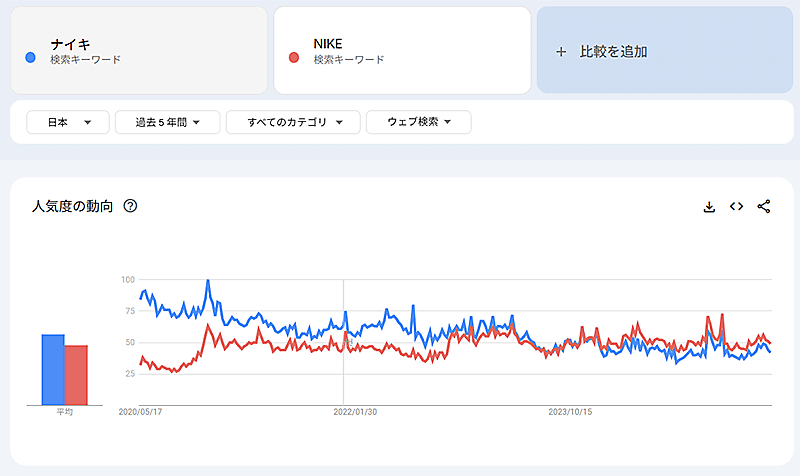 これらの記事を受け、「Googleトレンド」で直近5年の「ナイキ」の検索指標を見てみると、「ナイキ」は減少傾向ですが、「NIKE」ではやや上昇傾向にあります。「ナイキ」だけのグラフを用いれば簡単に「オワコンのように見せること」が可能になりそうです。