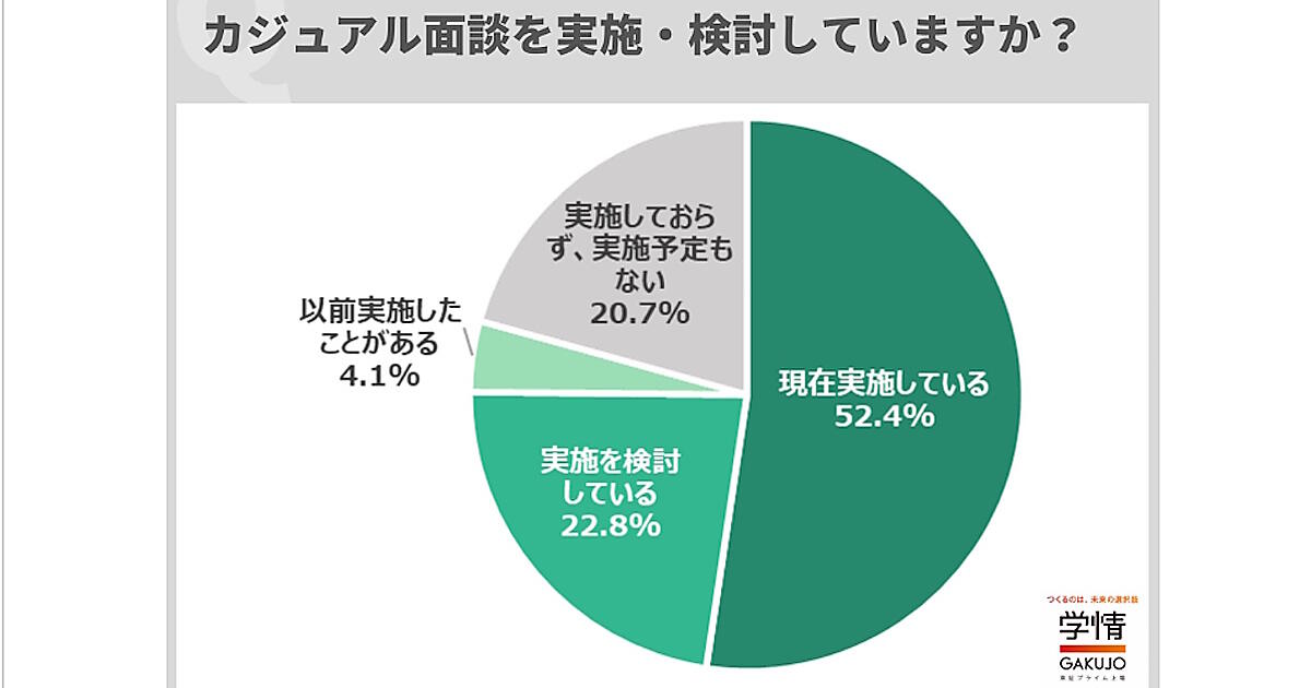学情が企業・団体の人事担当者を対象に実施した調査によると、転職潜在層へのアプローチや、選考参加を決断していない求職者と接点を持つことを目的にした面談「カジュアル面談」をキャリア採用で実施している企業は全体の52.4%だった。2024年の調査よりも15.7ポイント増えている。調査結果によると、カジュアル面談を行うことで、「ミスマッチの防止」を期待する企業が多い。