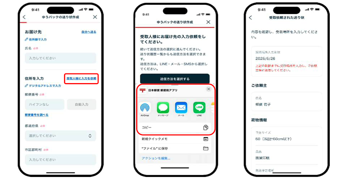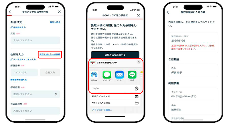 「郵便局アプリ」に「ゆうパックスマホ割サービス」の機能を追加。「カード事前決済で作成」で送り状を作成する際に、受取人に受取場所の入力を依頼する機能も実装した。差出人から受取人へ、SNSやメールなどにより、郵便局アプリが発行した受取場所の入力用URLを送付することで、相手先の住所がわからなくても荷物を送ることができる。